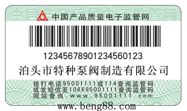 泊頭市特種泵閥制造有限公司自2008年5 月1 日出廠的產品,在產品合格證上粘貼長方形監(jiān)管碼標簽,上有20位數(shù)字,這就是產品監(jiān)管碼。因此,我公司生產的每件產品都將有一個“電子身份證”??梢岳霉潭娫?、手機短信、互聯(lián)網(wǎng)、超市終端等網(wǎng)絡通訊設備對電子監(jiān)管碼進行查詢,辨別真?zhèn)巍2樵冝k法如下: